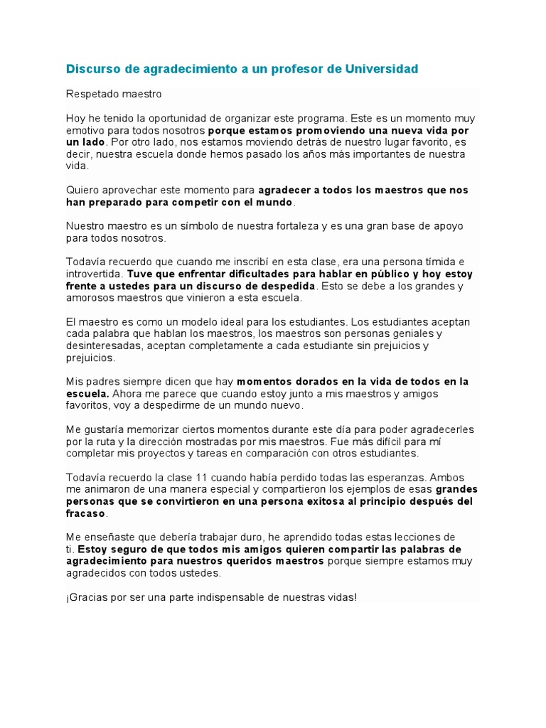Discurso De Agradecimiento A Un Profesor De Universidad Pdf